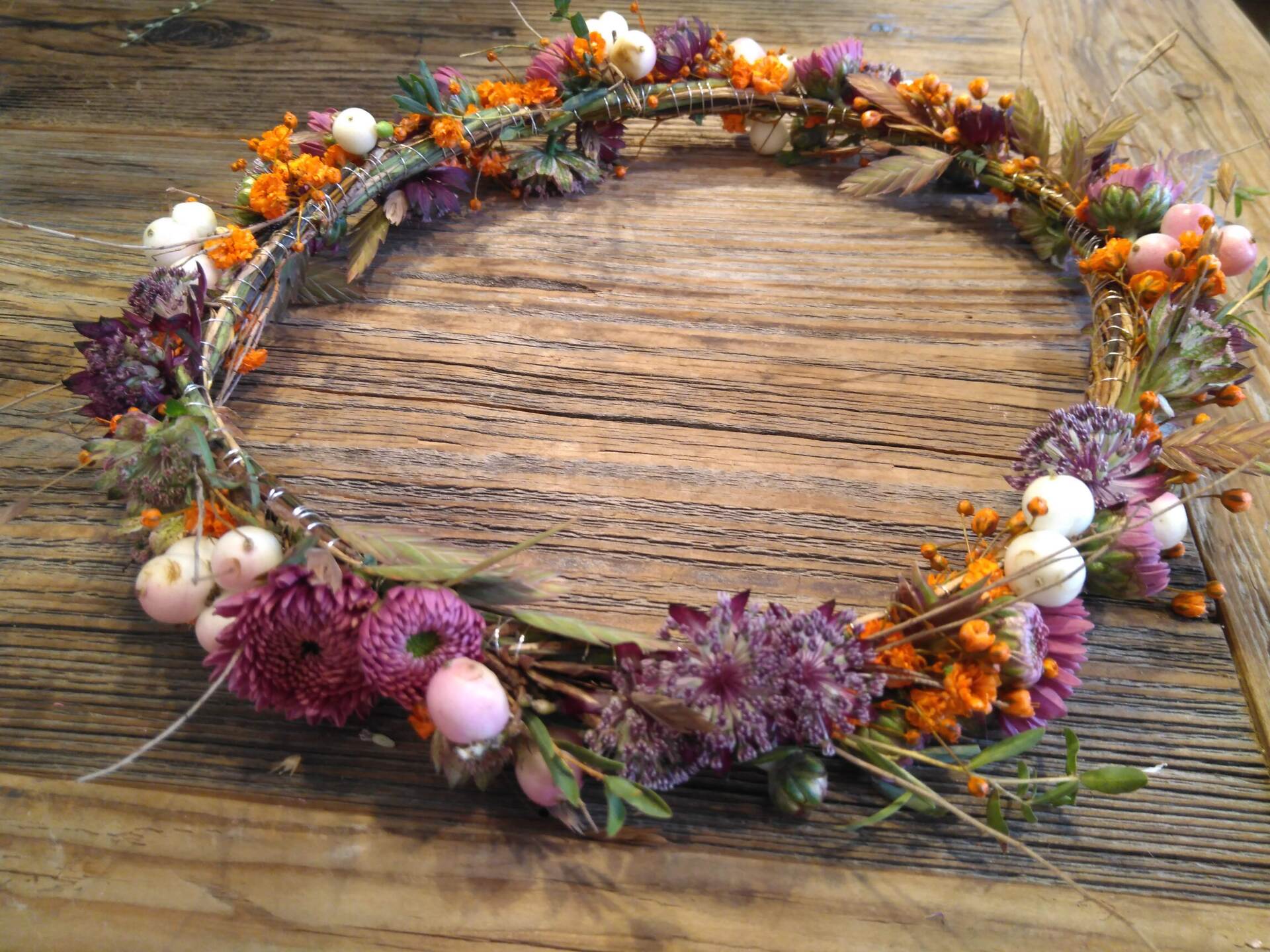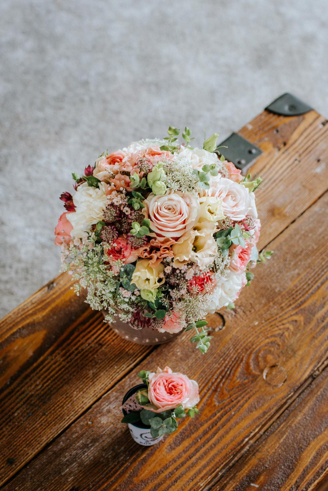 Das wichtigste Accessoire, der Brautstrauß, dazu passend einen Haarkranz.