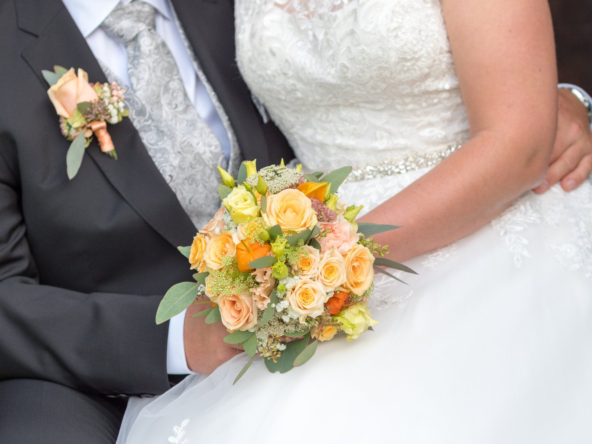 Den Bräutigam schmückt ein florales Einstecktuch.